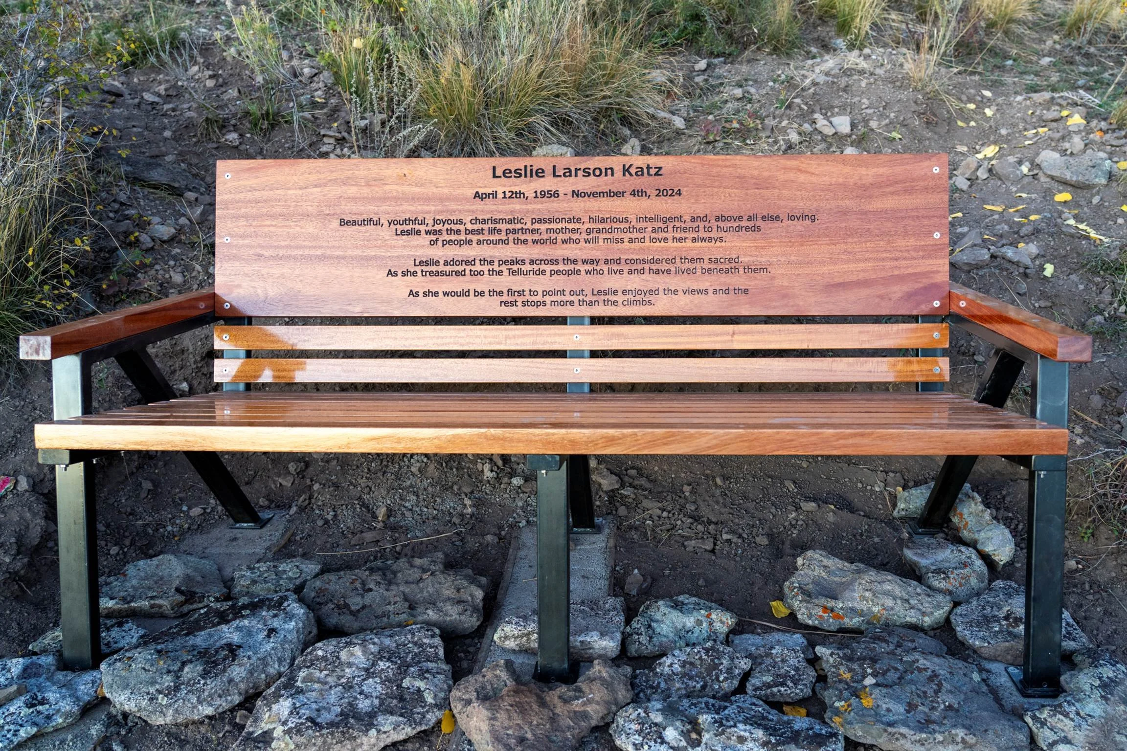 During her final days, Leslie asked us to commission a memorial bench, to be situated along one of our hiking trails in Telluride. Leslie and I honeymooned in Telluride in 1984, long before we returned to create a home and lasting friendships there over the past fifteen years. In October, the family gathered in Telluride to spread Leslie's ashes per her request, and to see the gorgeous bench and engraved epitaph. We cried together and we laughed telling stories. If you zoom in on the epitaph and knew Leslie, we hope you will see why we feel assured she would have approved – and why we think that we have tried to address the variously attributed adage, “grief is just love with no place to go.”